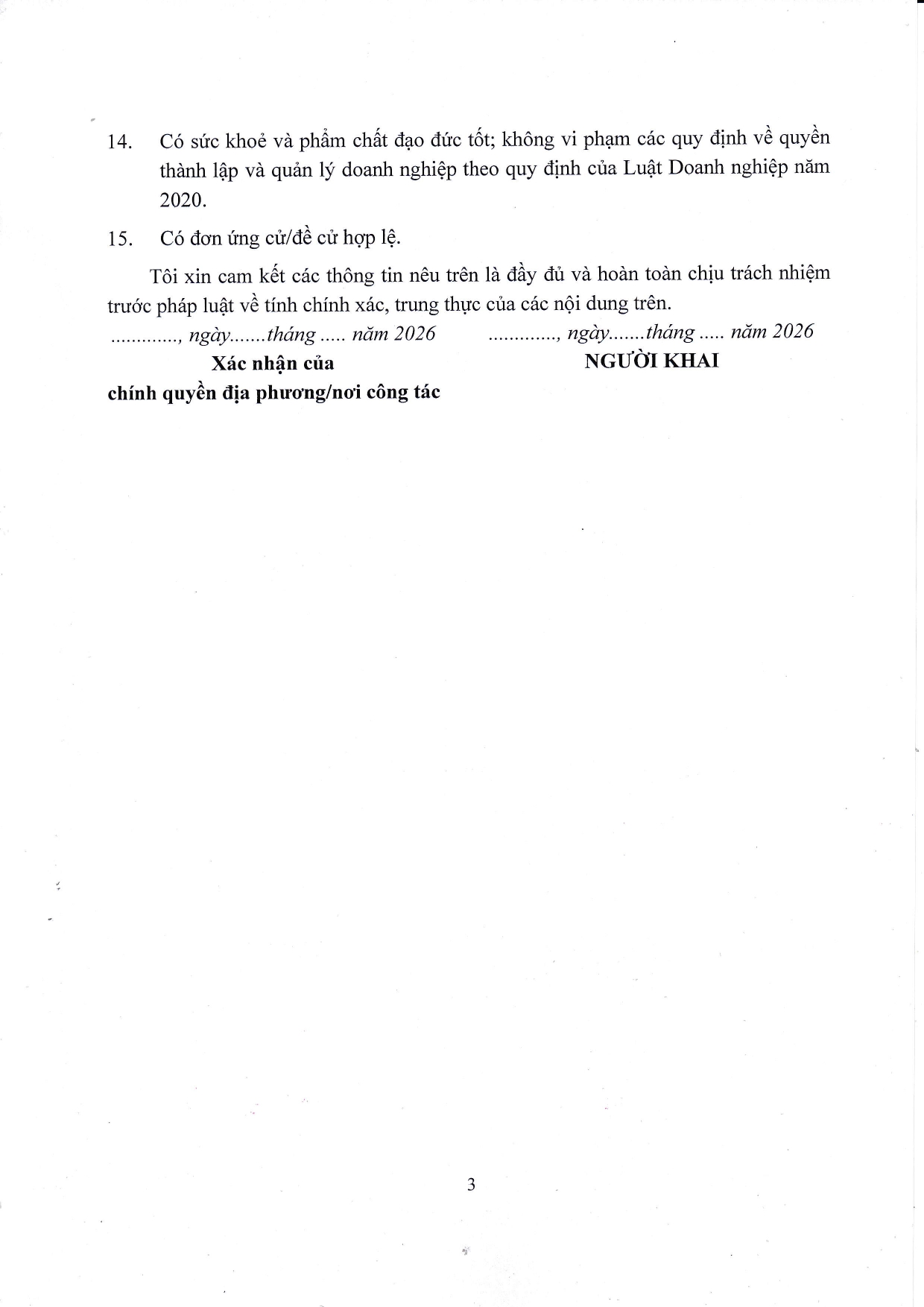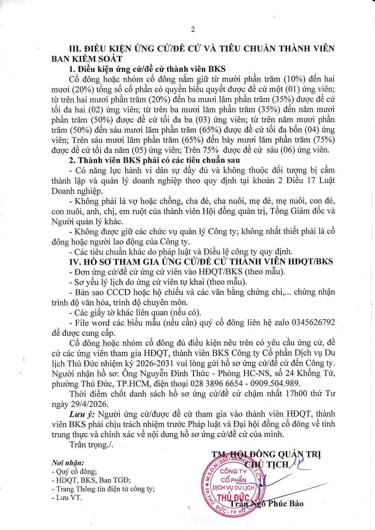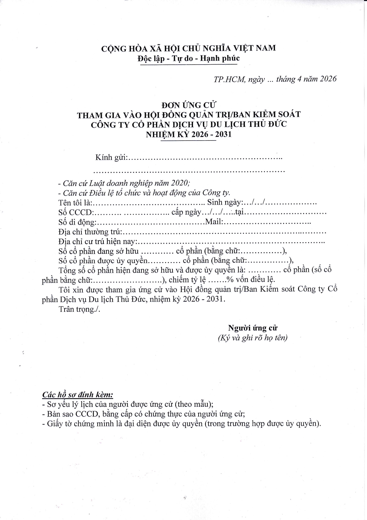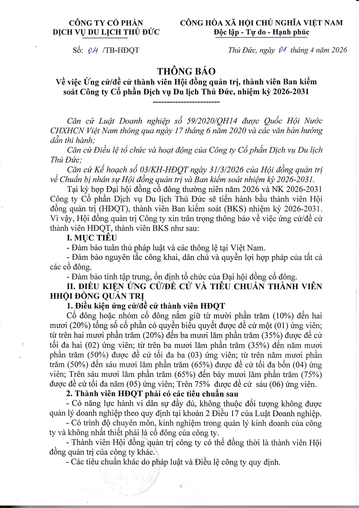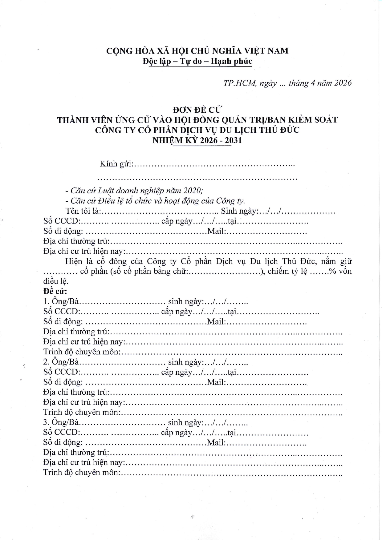 Thông báo về việc Ứng cử/đề cử thành viên HĐQT, thành viên BKS của Công ty nhiệm kỳ 2026-2031